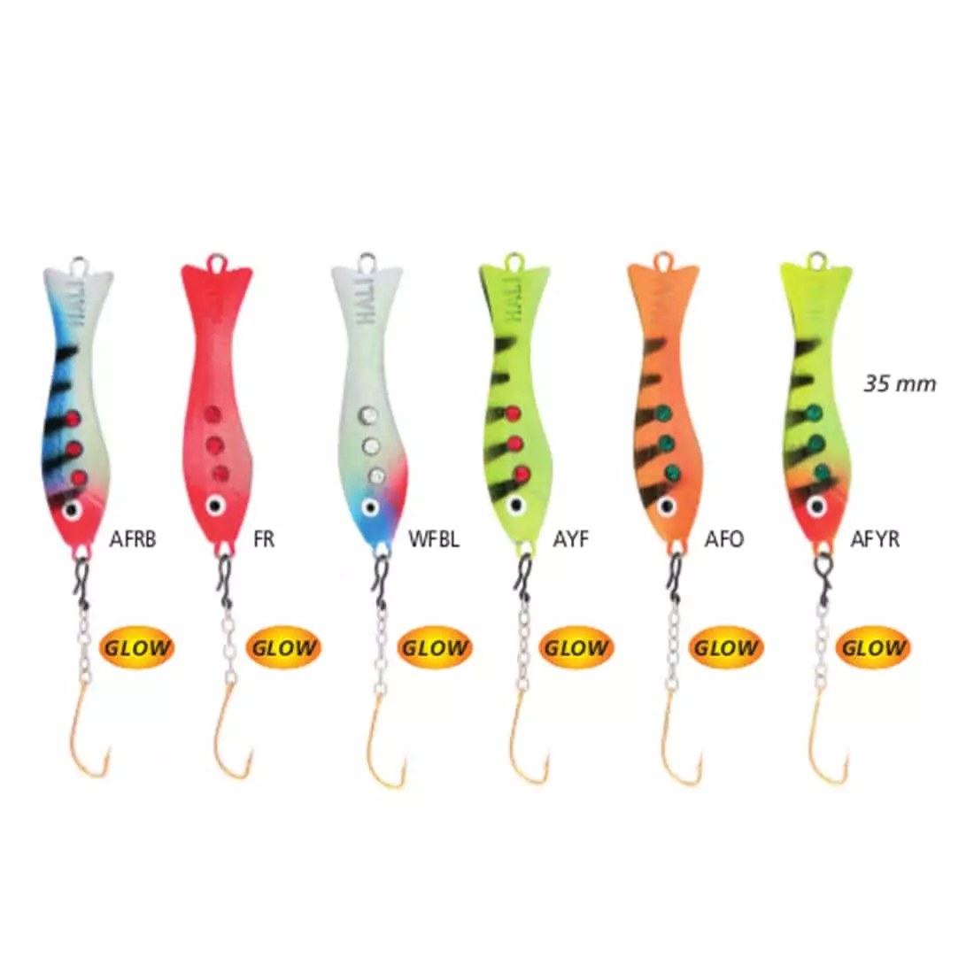 Fosforoitu pilkki. Kalan muotoinen pieni pilkki. Koot 25mm/3g ja 35mm/6g.