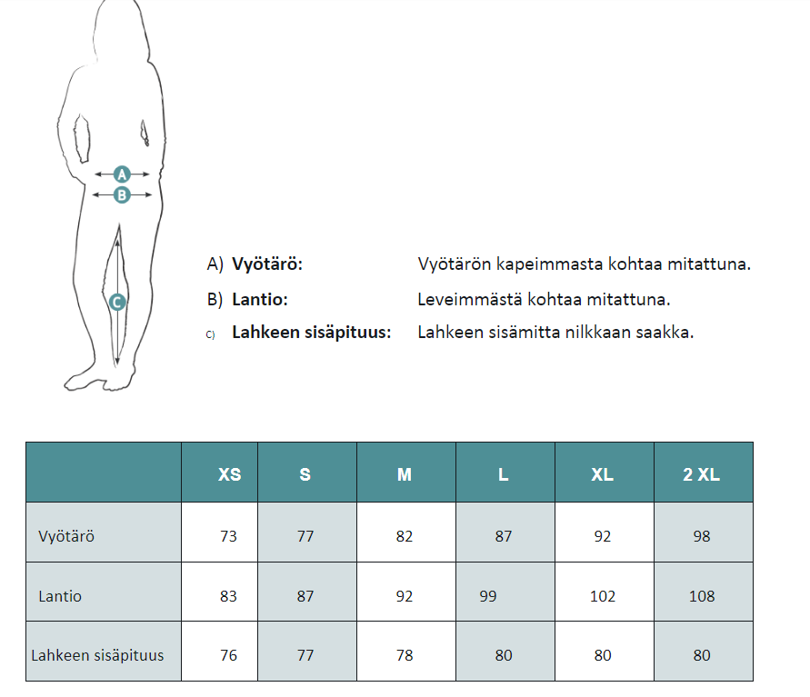Housuissa on kaksi sivutaskua ja reisitasku, joissa on kaikissa vetoketju. Säädettävä vyötärö tarranauhakiinnityksellä ja vetoketjulla kiinni nilkoissa.