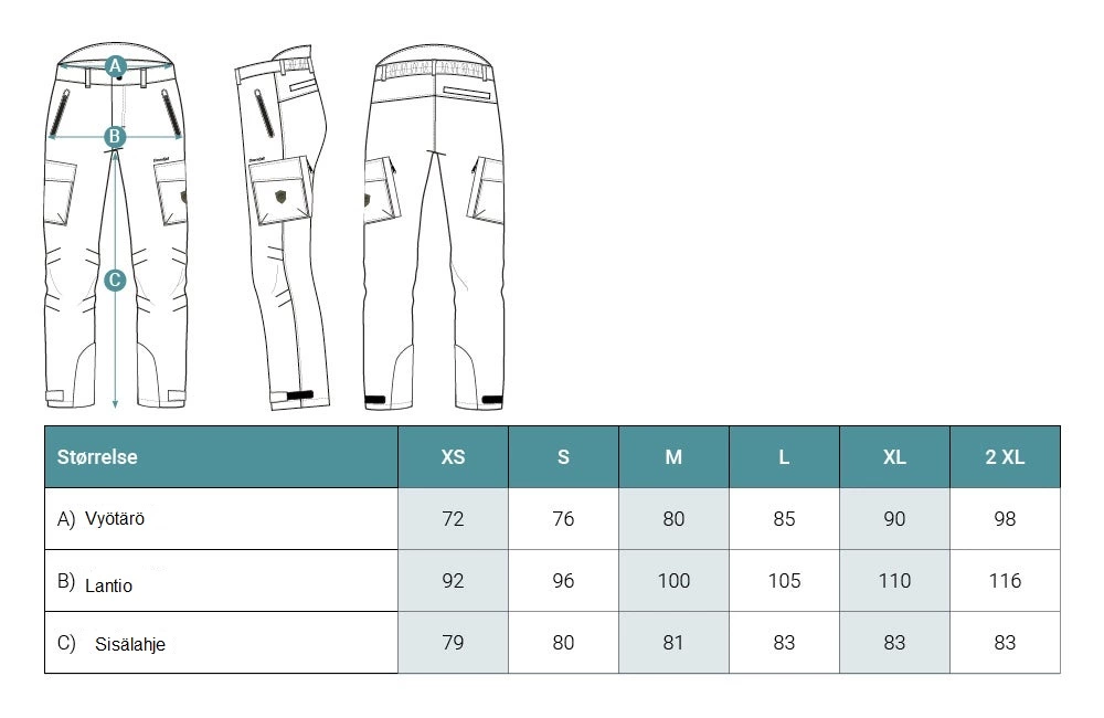Housuissa on kaksi sivutaskua, kaksi reisitaskua ja takatasku – kaikissa vetoketju. Tuuletus reisitaskujen takana olevasta aukosta, jotka voidaan sulkea vetoketjulla. Joustava kuminauha vyötärön sisäpuolella saa housut istumaan hyvin. Housuissa myös lenkit vyölle. Vedenpitävyys yli 10000 mm JIS 1092-1998 standardin mukaan. Hengittävyys yli 10000 gm/m2/h standardin JIS 1099 B mukaan.