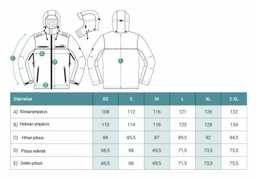 Takissa on tilava ja irrotettava huppu sekä hyvä ilmanvaihto vetoketjuilla käsivarsien alla. Takissa on kaksi sivutaskua ja VHF puhelin taskut molemmilla puolilla. Molemmissa olkapäissä on pidin antennille. Hihoissa tarranauha, vyötäröllä joustava kiristysnauha.