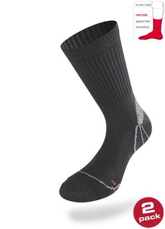 Lenzin Trekking Pro -sukkapaketti sisältää 2paria musta-harmaita sukkia. Materiaali:36% polypropyleeni, 27% polyesteriä(nailon), 22% polyamidia, 13% puuvillaa, 2% elastaania. Koot: 35-38 (koko-valinta 35) ja 43-46(koko-valinta 43).